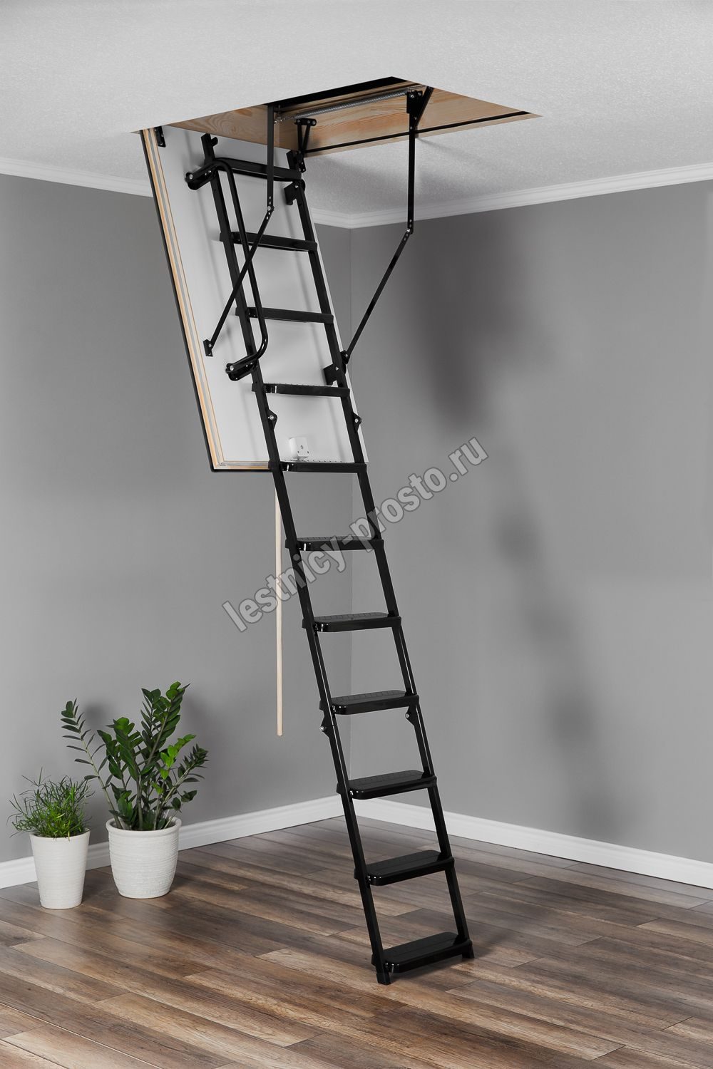 Противопожарная лестница, огнестойкость EI 60 Лестница чердачная складная металлическая 3-х секционная. Ступени полностью выполнены из металла и покрашена порошковой краской. Термоизоляционная крышка типа “сэндвич “, толщиной 66мм, утеплена пенопластом , облицована с двух сторон ДВП белого цвета. Короб деревянный высотой 170мм. Лестница имеет 3 уплотнителя, один проходит по периметру короба, и два по периметру крышки люка, в том числе и противопожарный.