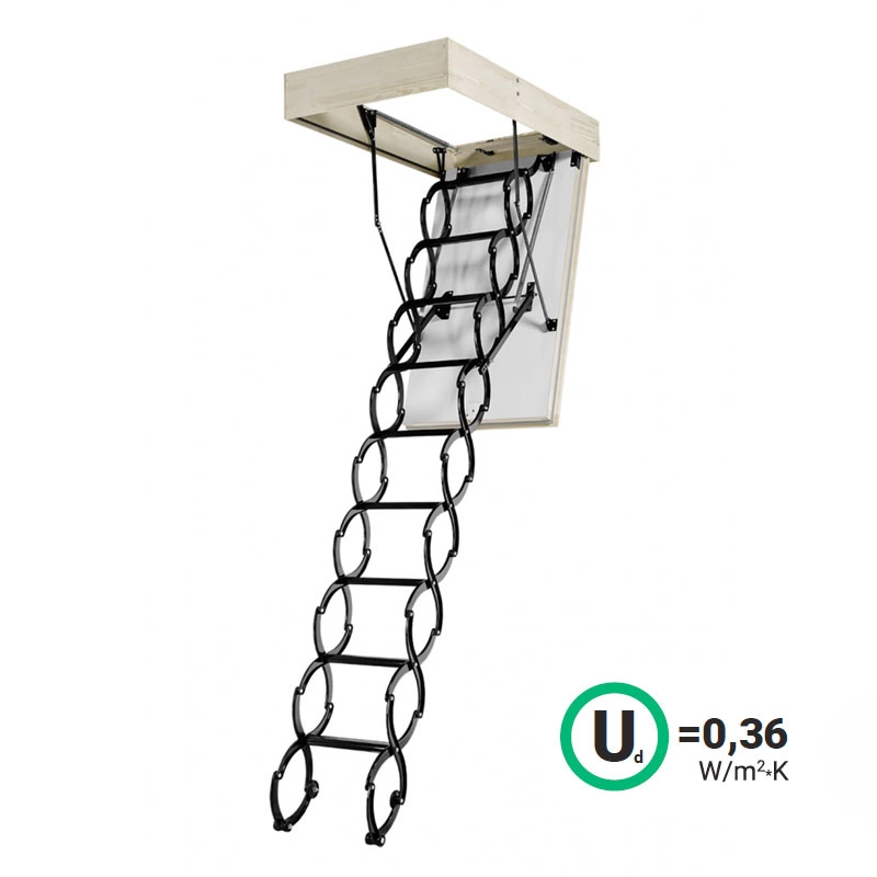 Складная 4-х секционная чердачная лестница. Рабочая поверхность полностью выполнена из алюминия. Термоизоляционная крышка типа "сэндвич" имеет усиленную теплозащиту, облицована с двух сторон ДВП белого цвета. По контуру короба имеется уплотнитель; Все металлические элементы лестницы покрыты порошковой краской.