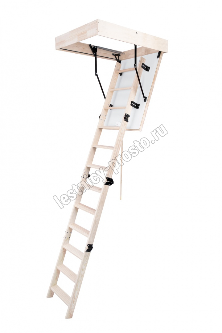 Лестница складная четырехсекционная, изготовлена из массива сосны. Термоизоляционная крышка типа "сэндвич" утеплена пенопластом толщиной 20 мм, облицована с двух сторон ДСП белого цвета