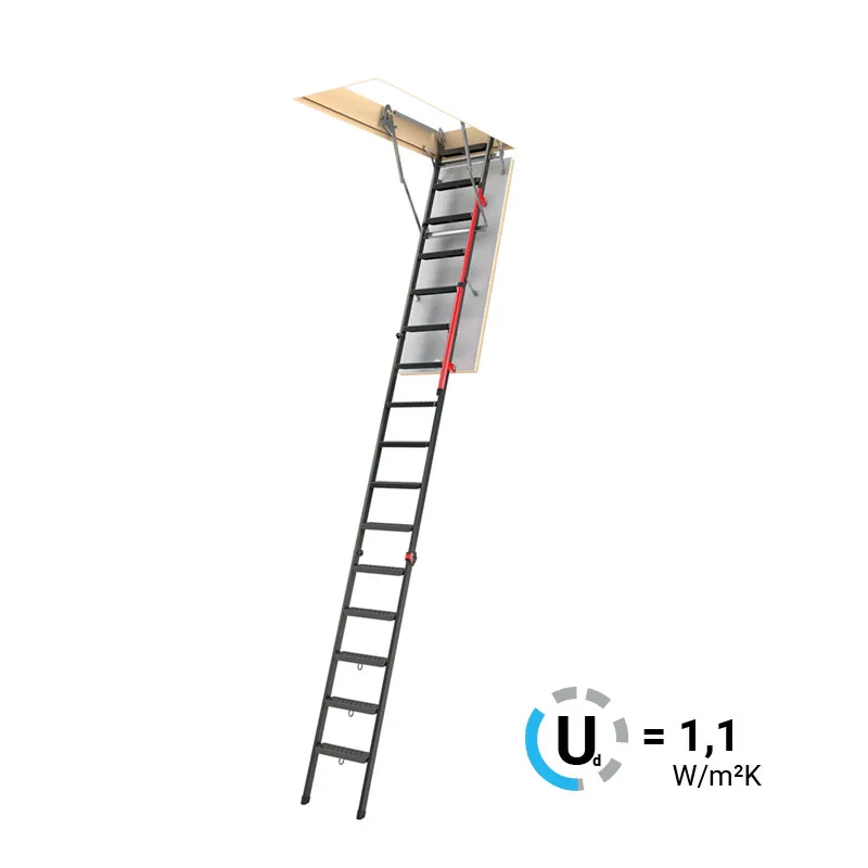 Лестница складная трехсекционная. Рабочая поверхность полностью выполнена из металла и покрашена порошковой краской. Термоизоляционная крышка типа "сэндвич", толщиной 47 мм, утеплена пенопластом, облицована с двух сторон ДCП белого цвета.