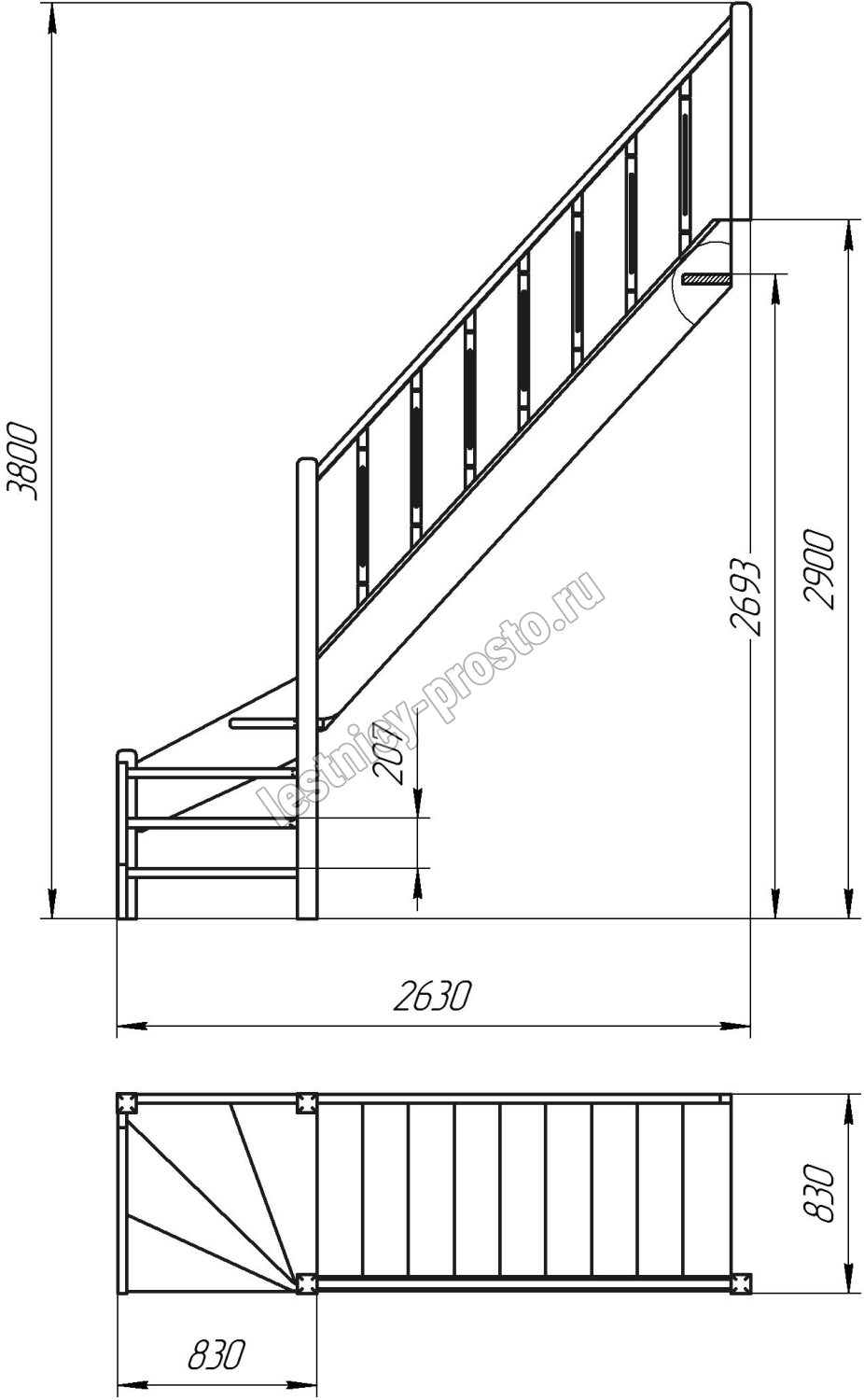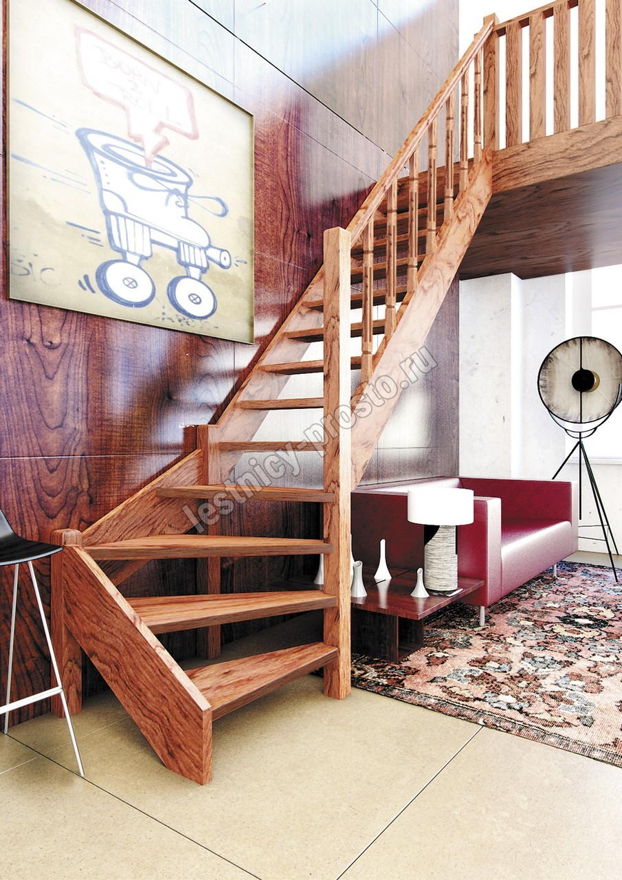 Деревянная межэтажная лестница ЛЕС-07 2693-2900 проем 2550-830, Лиственница