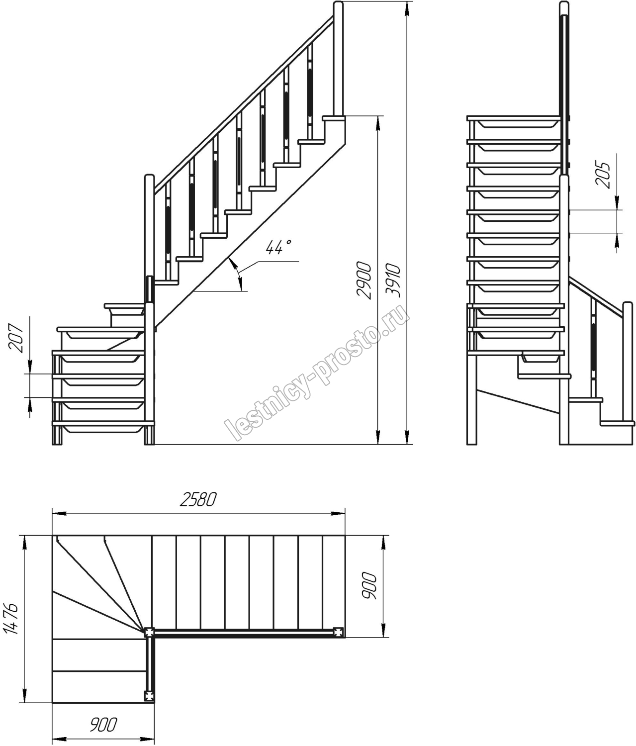 Деревянная межэтажная лестница ЛЕС-09 2900 проем 2580-900, Бук