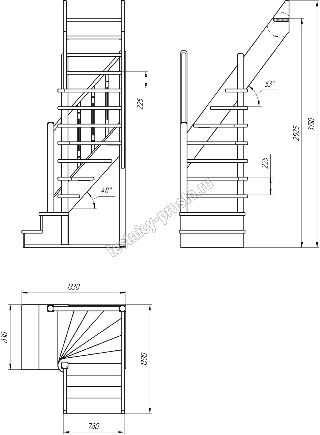 Деревянная межэтажная лестница ЛЕС-91 2925-3150 проем 1390-780, Сосна