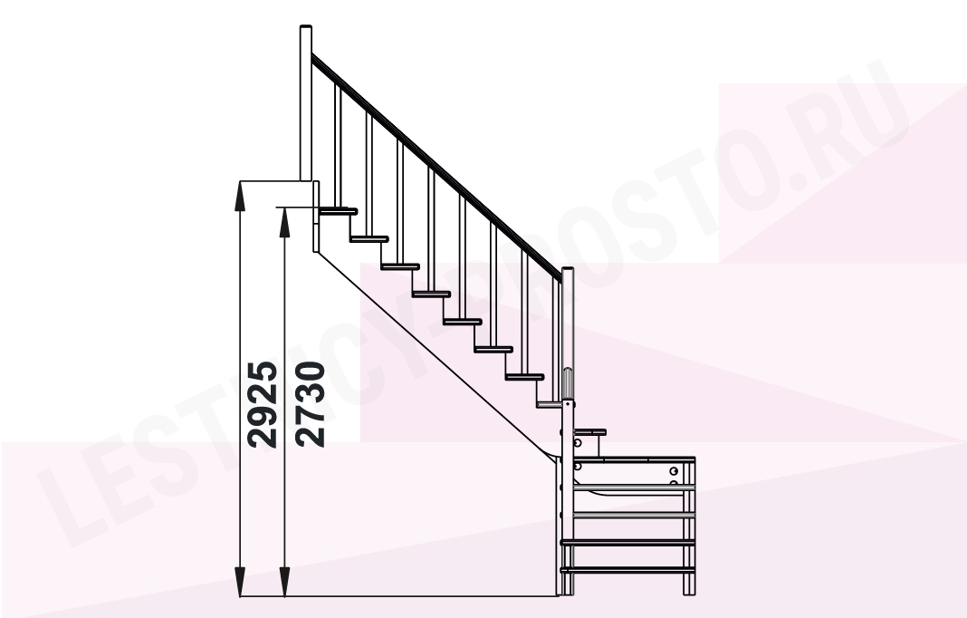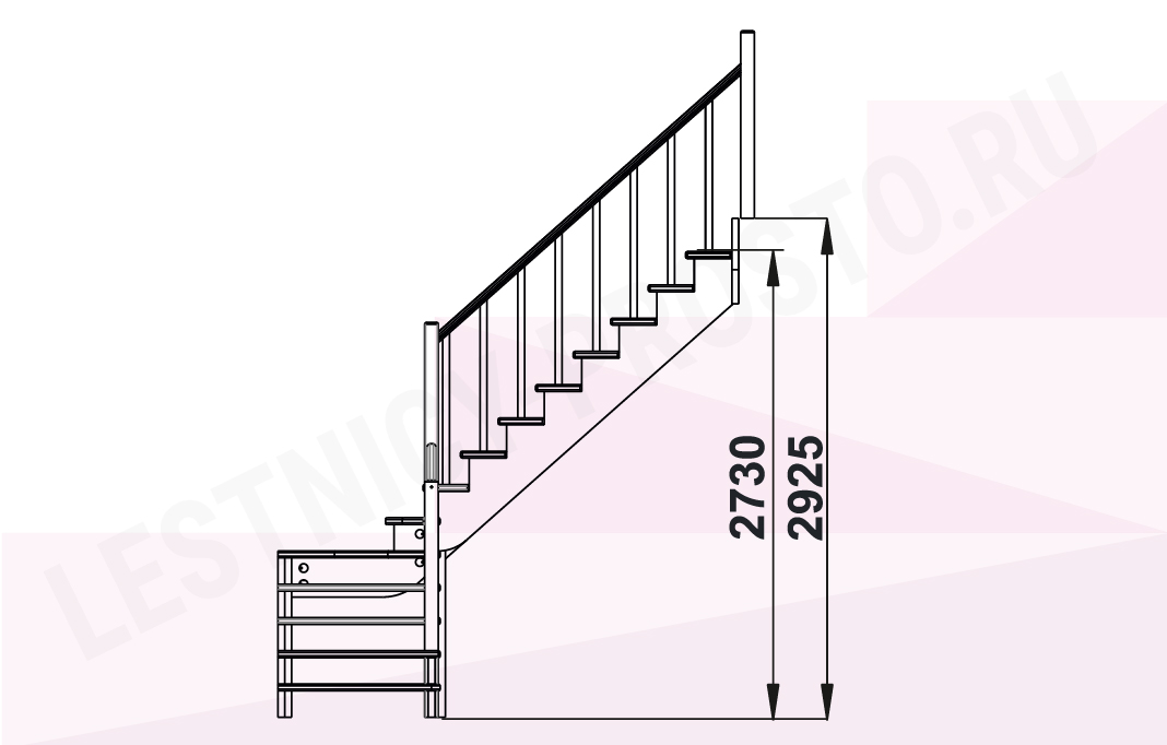Ступени и поручень лестинцы изготовлены из дуба, остальные элементы из сосны. Возможно изготовление данной модели полностью из дуба. Базовый комплект включает в себя деревянные элементы лестницы и ограждения без какого-либо покрытия.