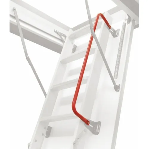 Боковой металлический поручень LXH красного цвета облегчает передвижение по лестнице и крепится к угловым петлям крышки люка. Может устанавливаться с одной или с обеих сторон лестницы.