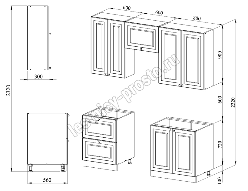Благодаря модульной системе такая кухня может быть собрана зеркально. В стандартной комплектации нижние тумбы оснащены регулируемыми ножками высотой 100 мм и цоколем из массива сосны 95 мм.