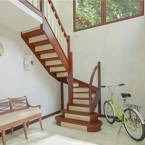 Ступени лестницы состоят из металлической рамки, обеспечивающей необходимую прочность, и покрытия из террасной доски ДПК (древесно-полимерный композит). Ступени не боятся воды и мороза, не теряют со временем свой внешний вид и не требуют ухода.