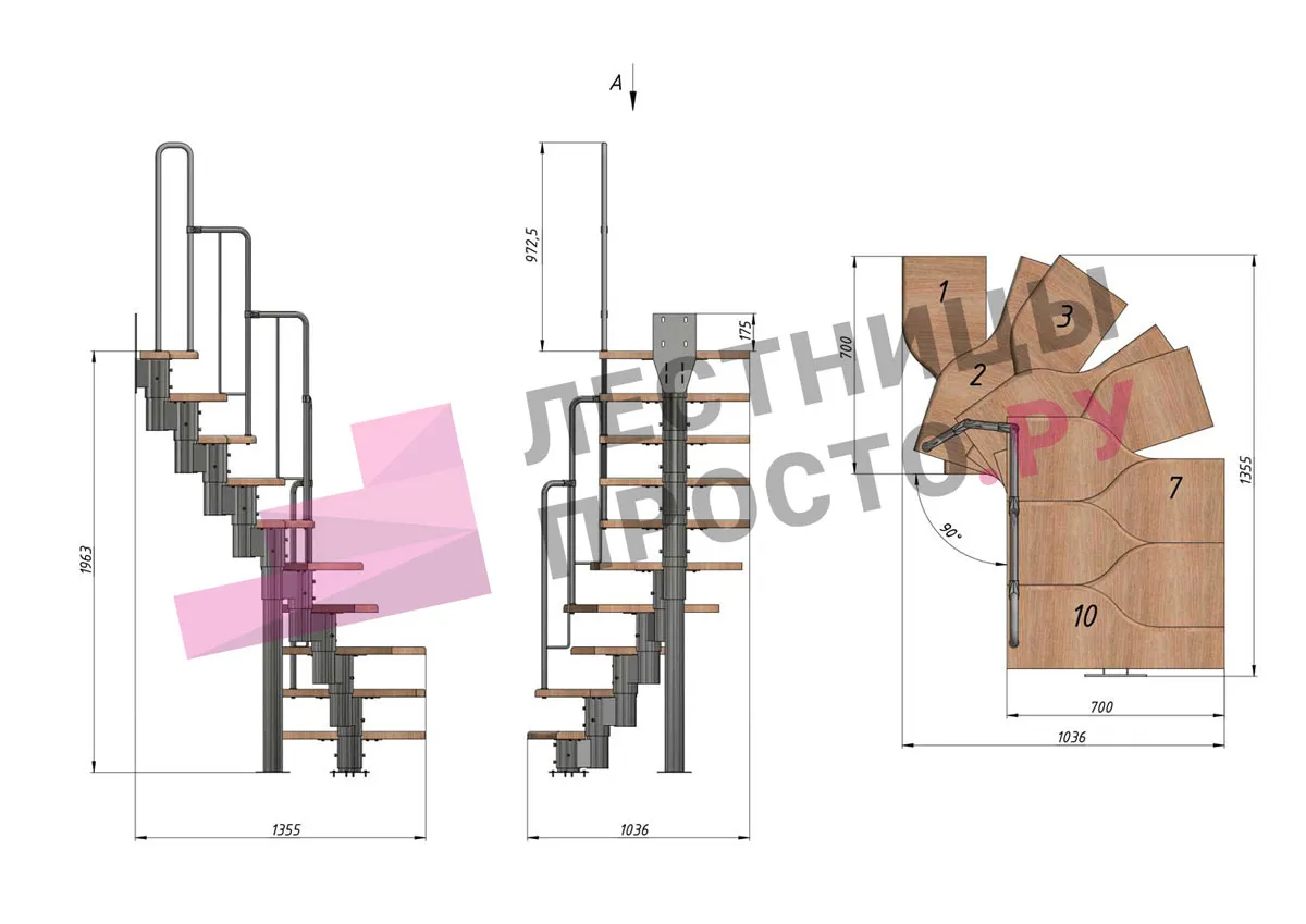 Лестница Prosto Urban Black гусиный шаг 700 мм, h180-264 см (10 ступеней), ясень