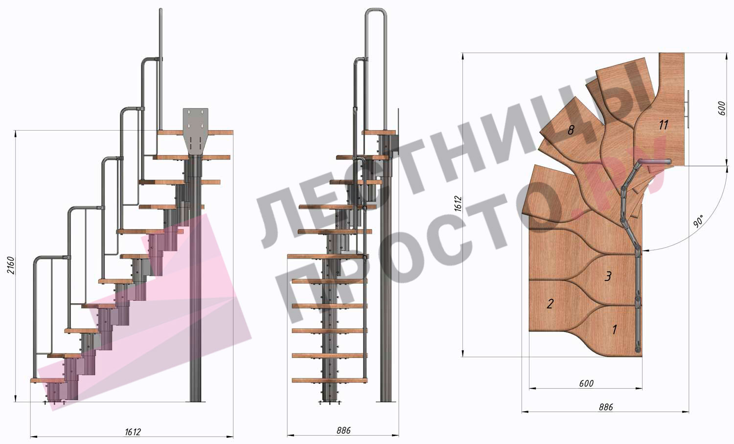 Лестница Prosto Urban Grey г-образная гусиный шаг 600 мм, h198-288 см (11 ступеней)
