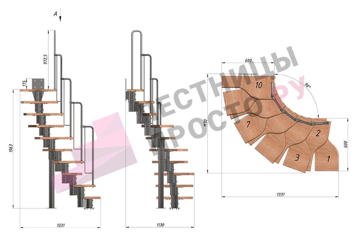 Лестница Prosto Urban Grey г-образная гусиный шаг 600 мм/ Ступени из берёзы мультиплекс