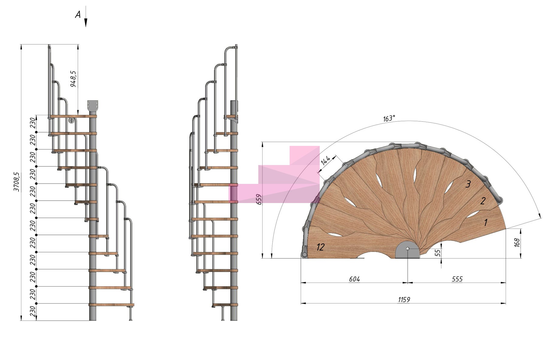 Винтовая лестница PROSTO MINI 60×120 см, h276-299 см