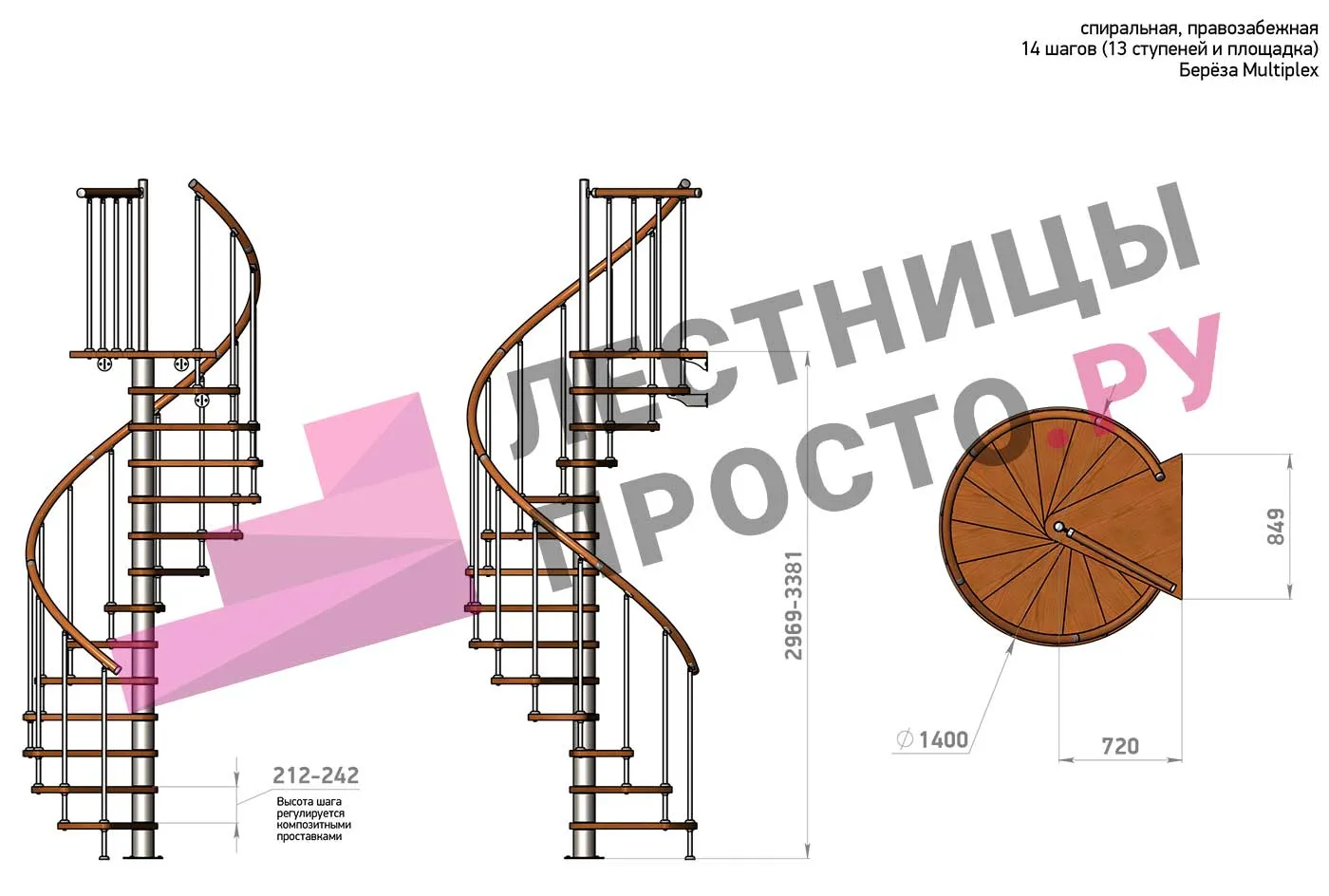Высота ступеней регулируется с шагом 3 мм. в пределах 212-242 мм., благодаря чему, лестница прекрасно подгоняется под необходимую высоту.