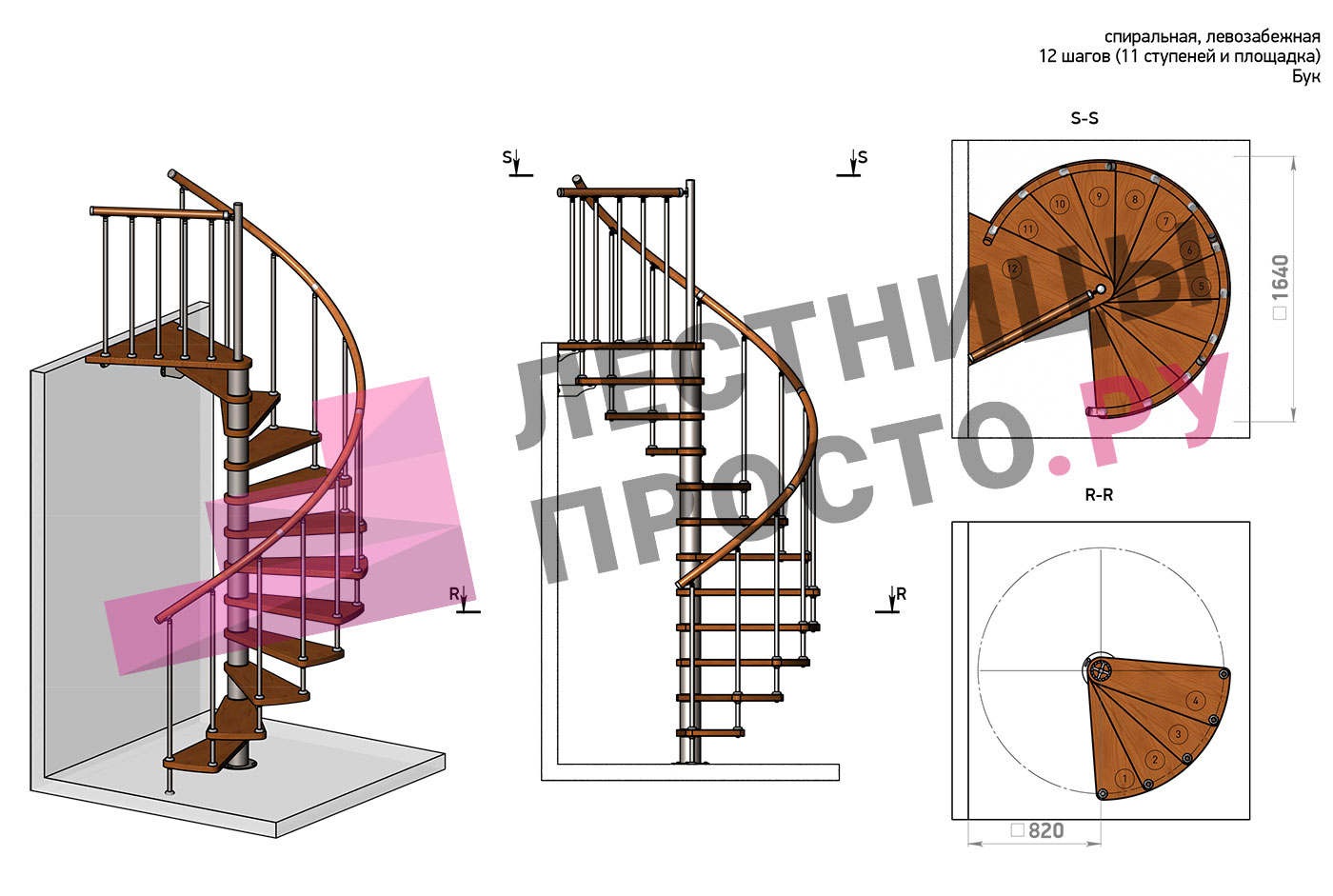 Левая, d=140см, 12 ступеней + площадка